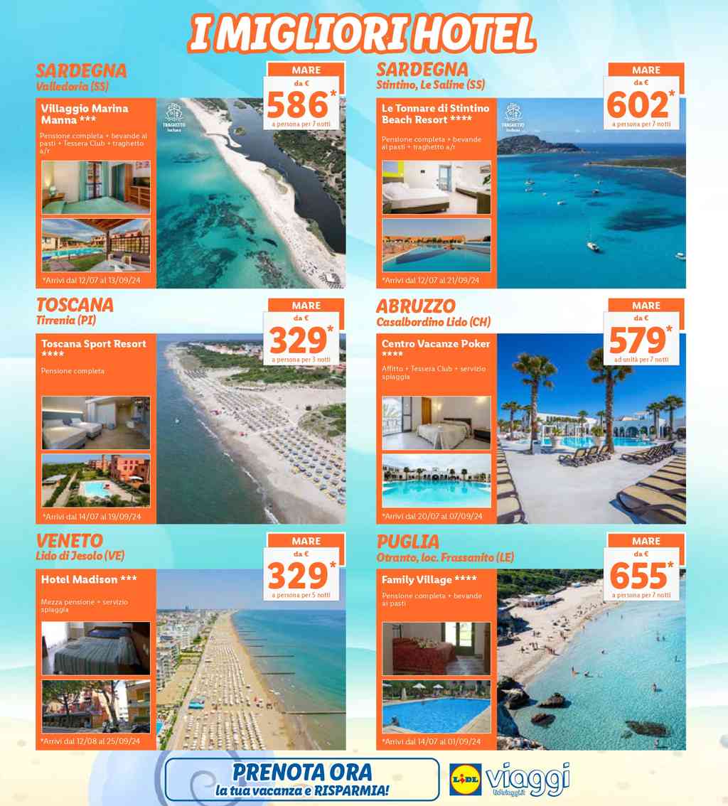 Lidl propone delle alternative di viaggio, dal 22 al 28 luglio 2024, per il mare e la montagna. Per una vacanza al mare, ci sono proposte come il soggiorno a Valledoria (SS) in Sardegna con pensione completa, bevande ai pasti, tessera club e traghetto incluso, a partire da 586 euro a persona per 7 notti. Un’altra alternativa è il soggiorno a Otranto in Puglia, presso il Family Village, a partire da 655 euro a persona per 7 notti.