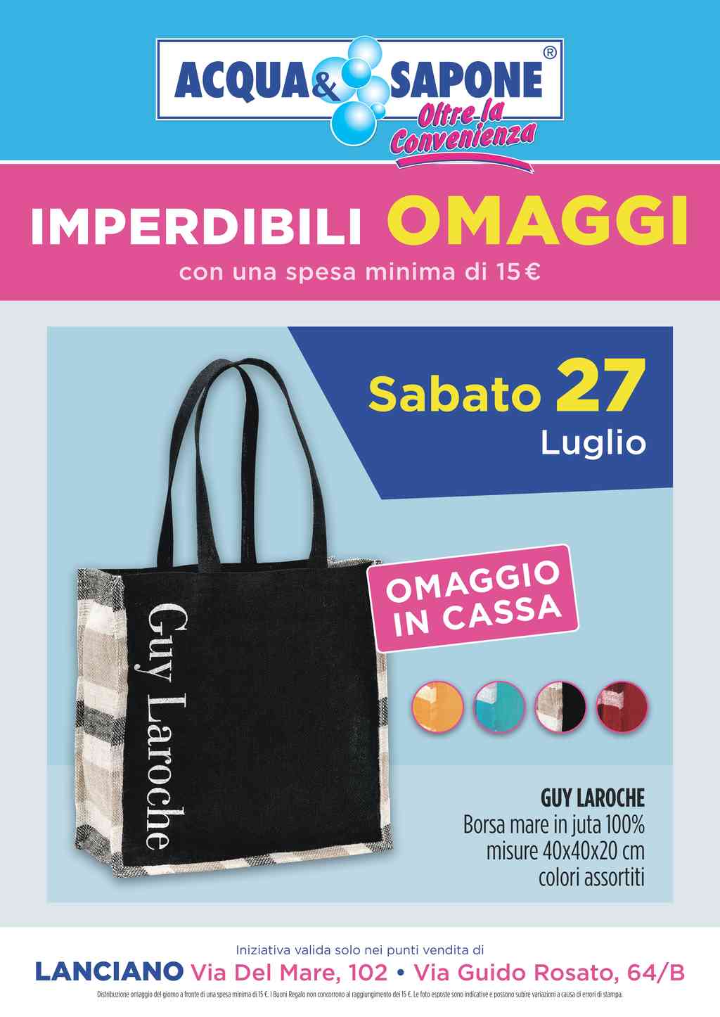 I negozi Acqua e Sapone di Lanciano, situati in Via Del Mare 102 e Via Guido Rosato 64/B, offrono dal 27 luglio al 17 agosto 2024 diverse promozioni e omaggi. Nel periodo dal 29 luglio al 4 agosto, con una spesa minima di 10 euro, è possibile ottenere un buono sconto di altrettanti 10 euro da utilizzare sulla spesa successiva di almeno 20 euro da effettuare dal 5 all’11 agosto 2024. Inoltre, ogni sabato è previsto un regalo per chi spende almeno 15 euro.