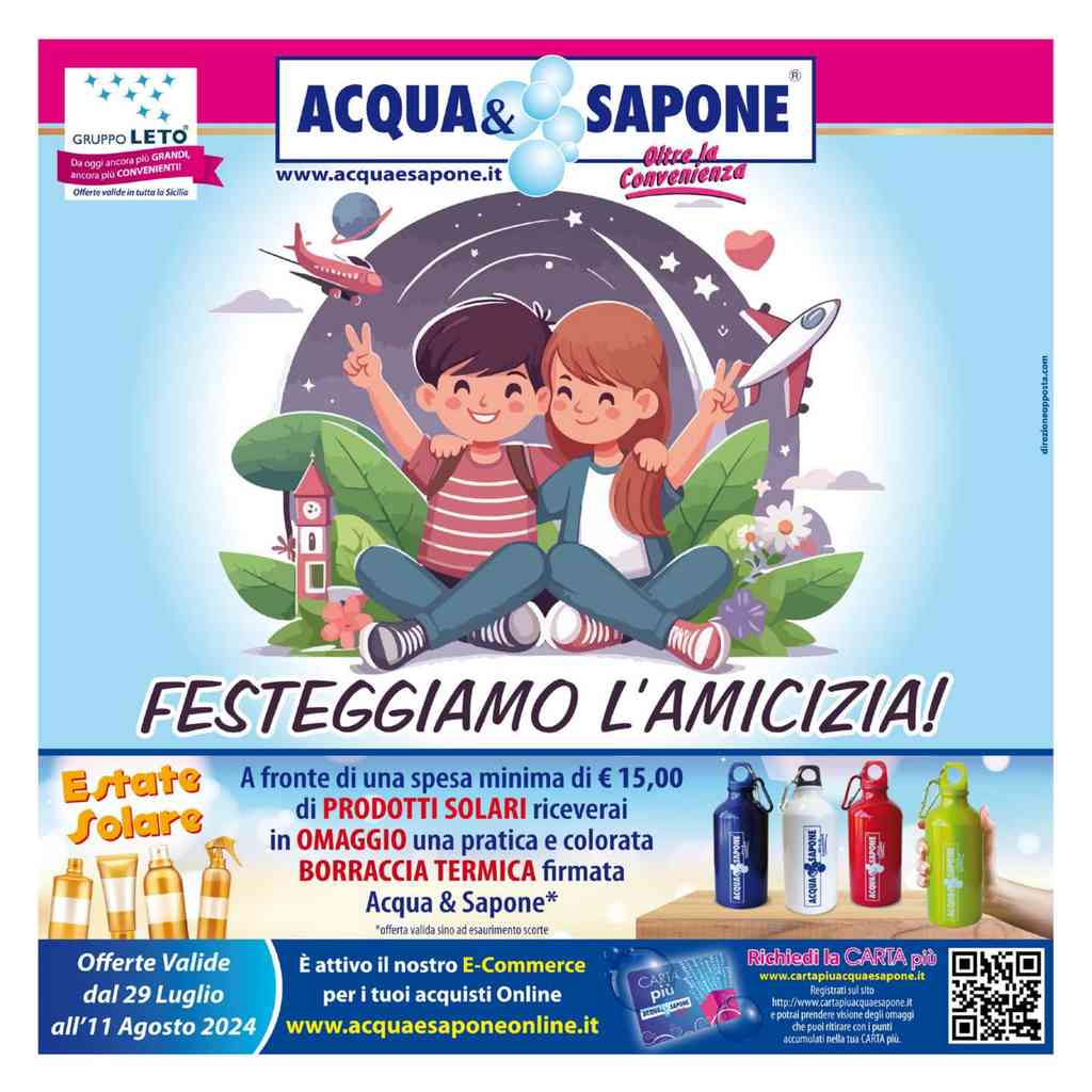 Il nuovo volantino Acqua e Sapone Sicilia, valido dal 29 luglio all’11 agosto 2024, ci aspetta con incredibili offerte! E una pioggia di sconti, omaggi, concorsi e rimborsi su una vasta gamma di prodotti: dai solari ai profumi, dal make-up ai detergenti. Vi consiglio quindi di sfogliare tutte le pagine del volantino Acqua e Sapone.