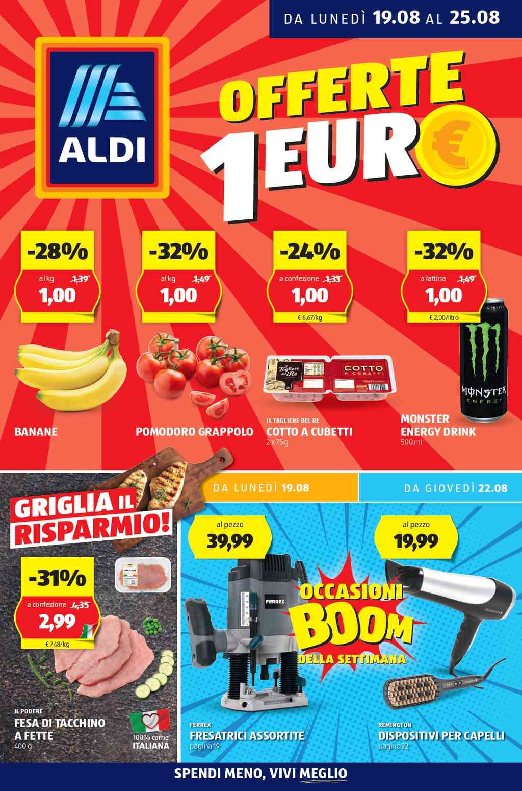 Il volantino Aldi per la settimana dal 19 al 25 agosto 2024 propone numerose promozioni su prodotti alimentari e non food. Tra le offerte spiccano frutta e verdura a 1 euro al kg, come pomodori grappolo, banane e pesche con cui fare il té freddo alla pesca. Ci sono sconti significativi su carne e pesce, oltre a prodotti lattiero-caseari. Non mancano le promozioni su bevande energetiche e prodotti confezionati, come passata di pomodoro e snack. Tra i non alimentari, si trovano offerte su lettini prendisole, set di trolley e dispositivi per capelli Remington.