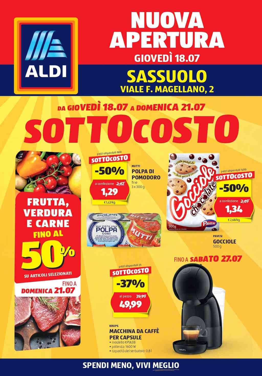 Il volantino annuncia l’apertura di un nuovo negozio Aldi a Sassuolo, situato in Viale F. Magellano, 2. L’inaugurazione avverrà giovedì 18 luglio 2024. Per celebrare l’apertura, il negozio offrirà numerosi sconti e promozioni valide fino al 27 luglio 2024. Gli orari di apertura saranno da lunedì a sabato dalle 8:00 alle 21:00, mentre la domenica dalle 9:00 alle 20:00.