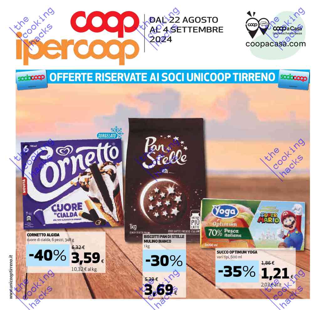 Nel volantino Coop Ipercoop Tirreno dal 22 agosto al 4 settembre 2024 sono presenti diverse offerte riservate ai soci Unicoop Tirreno. Tra i prodotti scontati troviamo i biscotti Pan di Stelle Mulino Bianco con uno sconto del 30%, il succo Optimum Yoga scontato del 35% e il Cornetto Algida (6 pezzi) scontato del 40%. Altri prodotti in offerta includono il Barattolino Delizie Sammontana (500 g) scontato del 35%, il Grana Padano DOP Virgilio scontato del 35%, il caffè Qualità Rossa Lavazza (4×250 g) con uno sconto del 25% con cui vi ricordo le alternative di uso dei fondi di caffè. Ricordatevi che tutte le offerte riservate ai soci sono soggette a limiti di pezzi massimi di acquisto.