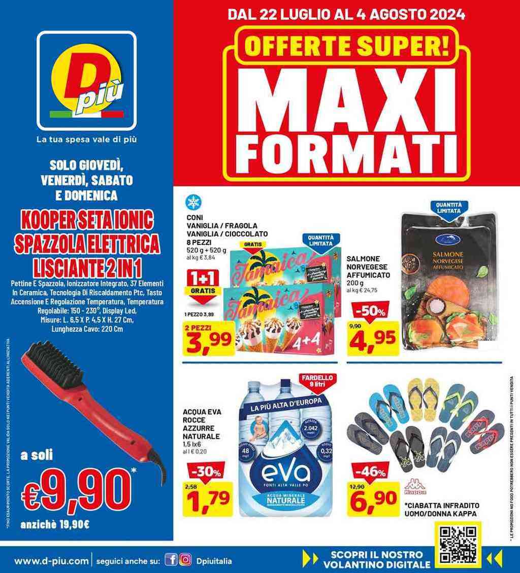 Il volantino DPiù dal 22 luglio al 4 agosto 2024 presenta numerose offerte su vari prodotti, con particolare rilievo alla promozione principale dei maxi formati e del 1+1 gratis. La prima pagina del volantino mette in risalto le diverse offerte di prodotti alimentari e non, tutti presentati in formati convenienza o con quantità limitate.
